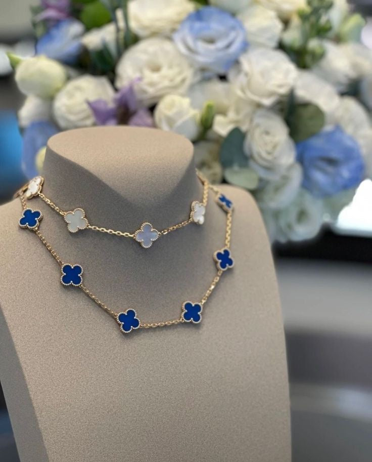 Elevate your elegance with this timeless Blue Van Cleef inspired set necklace. Featuring delicate clover-shaped charms in a stunning deep blue enamel, framed with fine gold detailing, this piece is the perfect balance of sophistication and everyday luxury.